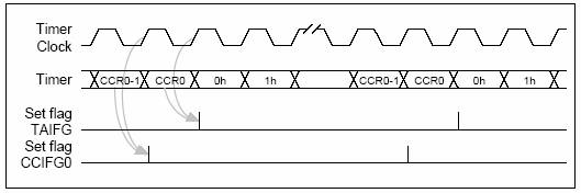 Vėliavėlė CCIFG0 nustatoma į reiksmę "1", kai taimerio reiksmė tampa lygi palyginimo ir fiksavimo registrui CCR0. Vėliavėlė TAIFG nustatoma į reiksmę "1", kada skaičiuojama nuo reiksmės esančios registre CCR0 iki 0. Visos pertraukimų vėliavėlės nustatomos nepriklausomai nuo pertraukimo leidimo bito. Jeigu naudojamas pertraukimo rezimas ir nustatomas pertraukimo leidimo bitas. Taip pat reikalingas GIE bito nustatymas.