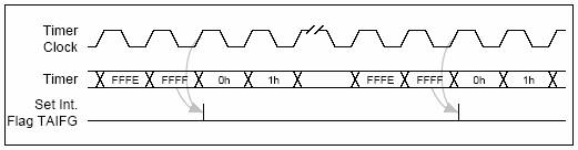 Pertraukimo vėliavėlė CCIFG0 yra nustatoma, kai taimeris skaičiuoja nuo CCR0-1 iki CCR0. Pertraukimo vėliavėlė TAIFG nustatoma, kai 16 bitų taimeris skaičiuoja mazėjimo kryptimi nuo 0001h iki 0000h.