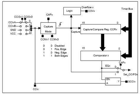 Fiksavimo (Capture) rezimas paprastai naudojamas įjungimui tam tikrų operacijų fiksuotu laiko momentu. Jis gali būti panaudotas greičio ar laiko intervalų matavimams. Darbo rezimai nustatomi bitu CAPx kontrolės zodyje CCTLx. Galima parinkti palyginimo rezimą (CAPx = 0) arba fiksavimo rezimą (CAPx = 1). Parinkus fiksavimo rezimą, fiksavimo signalai (CCIxA, CCIxB, GND arbaVCC) parenkami su bitais CCISx1 ir CCISx0 kontrolės zodyje CCTLx. Pasirinktų signalų fiksuojamasis frontas, parenkamas su bitais CCMx1 ir CCMx2. Frontas gali būti fiksuojamas kylantis, krentantis, kylantis - krentantis arba nefiksuojamas. Prie fiksavimo - palyginimo bloko įėjimų CCLxA arba CCLxB gali būti prijungiami isoriniai įvadai - isvadai. Skirtingiems MSP430 seimos mikrovaldikliams naudojami skirtingi signalai.