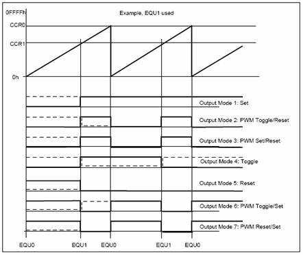 Perjungimo/įjungimo rezimas (Toggle/Set). Kai taimeris pasiekia TACCRx reiksmę, signalas EQUx perjungia Outx isėjimo signalą, o isėjimas įjungiamas signalu EQU0, signalas sinchronizuotas su taimerio taktiniais impulsais. |