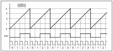 Isėjimo signalo rezimas gali būti keičiamas skaičiuojant taimeriui iki CCRx reiksmės arba skaičiuojant taimeriui nuo CCR0 iki 0. Isėjimo signalas yra modifikuojamas pagal parinktą isėjimo rezimą.