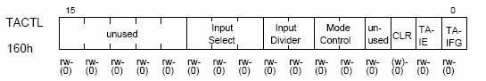 Bitas 0 : TAIFG vėliavėlė fiksuoja taimerio prisipildymą. Didėjimo rezime nustatoma vėliavėlė TAIFG skaičiuojant nuo CCR0 iki 0000h. Istisiniame rezime nustatoma vėliavėlė TAIFG, skaičiuojant nuo 0FFFFh iki 0000h. Didėjimo - mazėjimo rezime, fiksuoja taimerio skaičiavimą mazėjimo kryptimi iki 0000h.