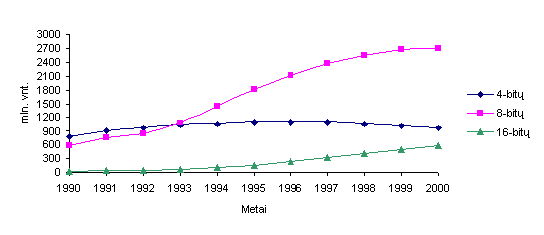 2 pav. Mikrovaldiklių pardavimai pasauliniu mastu (mln.vnt. per metus)