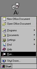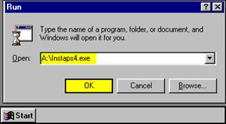 Įdedame pirmąjį instaliacinį diskelį Nr.1 (BDE) ir atliekame analogiskus veiksmus, parodytus 1-2 pavyzdyje (t.y. : Start.Run.A:.Browse).