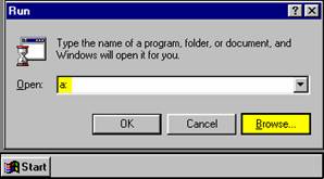 Ekrane pasirodo langas Run , panasus kaip 2 pavyzdyje. Lango eilutėje Open surenkame tekstą a: ir nuspaudziame mygtuką Browse.