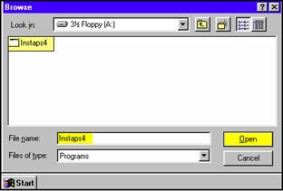 Pasirodo langas Browse , panasus kaip 3 pavyzdyje. Lango viduje pazymime bylą Instaps4 ir paspaudziame mygtuką Open (ankstensnėje versijoje gali būti Instaps).