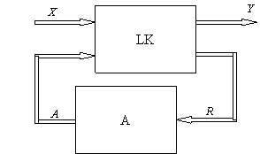Panaudojus atminties, arba vidinės būsenos, sąvoką ir remiantis israiskomis (6) ir (7), automatą galima pavaizduoti struktūrine schema (2 pav.), kurioje LK loginis keitiklis, o A - atminties blokas. Sis automatas veikia taip: takto t metu loginis keitiklis formuoja isėjimo signalą Y(t). ir grįztamojo rysio signalą R(t), priklausančius nuo įėjimo signalo reiksmės X(t) ir vidinės būsenos A(t). Grįztamojo rysio signalo R(t) paskirtis - kito, (t+ I) takto metu pervesti automatą į naują vidinę būseną A(t+1).