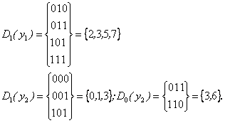 1.1.5. Reiksmių sritys. Funkcija pateikiama kaip sąrasus ar sąrasai argumentų rinkinių, kuriems esant, ji įgyja vienokią ar kitokią reiksmę. Sąrasas argumentų rinkinių, kuriems esant funkcija y lygi 1, vadinamas jo vienetų sritimi D1(y), o kai si reiksmė lygi 0, - nulių sritimi D0(y). Nevisiskai apibrėztos funkcijos dar turi neapibrėztumo sritį D*(y).