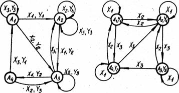 Pirmuoju atveju (2.10) būsenos laikomos ekvivalentinėmis besąlygiskai. Jei baigtinis automatas pateikiamas lentelėmis, sias būsenas atpazinti nesunku: jas atitinkantys stulpeliai yra vienodi. Pavyzdziui, pav., pateiktame automate S1 būsenos A3 A5 ir A4 A6 ekvivalentinės besąlygiskai. Ekvivalentiniame automate S2 jos sujungtos pazymint (A3 A5)=A35=A3 ir (A4 A5)=A45=A4.