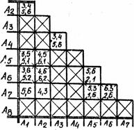 Trikampės lentelės. Minimizuojant trikampių lentelių metodu, automatas "turi būti pateikiamas lentelėmis (geriau sutapatintosiomis) (2.13 pav.). Nubraizoma trikampė (n─1) (n─1) lentelė (2.54 pav.), kurioje kiekvienai būsenų porai skiriamas langelis. čia n - automato vidinių būsenų skaičius. Lentelė uzpildoma tikrinant visų būsenų ekvivalentiskumą (nuosekliai taikant jo apibrėzimą