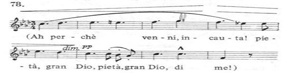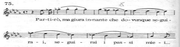 Ugyanennek a gondolatnak a második megjelenésekor a szöveg már kérővé, követelőzővé válik: "Elmegyek, de esküdj nékem, hogy te vélem jössz, hogy vélem jössz most, bárhová is menjek." S most már a dallamban visszatér a jellegzetes lefelé hajlás. A jelenetnek a megfelelő drámai kiélezettségét a kromatikus lépések biztosítják.
