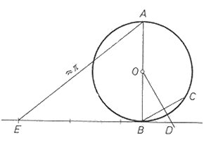 Végül húzzuk meg az EA szakaszt. A Pitagorasz-tételnél többet nem kívánó számítással belátható, hogy AE ~ 3,14153...