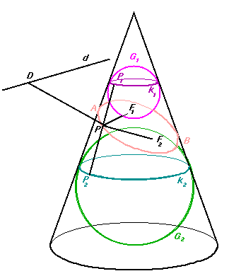 Legyen P a síkmetszet egy tetszőleges pontja. Illesszünk a kúpba olyan gömböket, amik érintik a kúpot és a metszősíkot is. A G1 gömb a kúp palástját k1 körben, a síkot F1 pontban érinti. A G2 gömb a kúpot k2 körben, a metszősíkot F2 pontban érinti. P-ből húzzunk a gömbökhöz érintőszakaszokat! Teljesül rájuk, hogy PP1=PF1 és PP2=PF2. Ugyanakkor PP1 és PP2 egy, közös alkotón vannak, az általuk alkotott alkotódarabot k1 és k2 határolják. A síkmetszetnek bármely pontjáról legyen is szó, a gömbökhöz rajzolt érintőszakaszok együtt a paláston mindig a két kör között helyezkednek el, nagyságuk így állandó. Másrészről az érintési tulajdonság miatt a síkbeli érintőszakaszok hosszának összege, PF1+PF2 PP1+PP2 is állandó nagyságú. Ezzel kaptunk két adott pontot: F1-t és F2-t, amelyektől mért távolságösszege P-nek mindig ugyanakkora. Definíció szerint síkmetszetünk egy ellipszis.