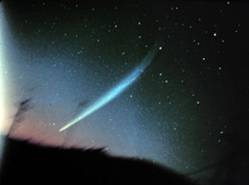 Amikor az üstökös 1,5 - 2 CSE-re megközelítette a Napot, a Napból kiáramló, elektromosan töltött részecskék (a napszél) magukkal ragadják a kómából a gázt és a port, így jön létre a csóva. A csóva egy kissé mindig meggörbül az üstökös haladási irányával ellentétes irányban, de mindig a Nappal ellentétes irányba húzódik. Nem Hosszú és erős csóvák akkor képződnek, ha az üstökösnek gazdag gáztartalékai vannak, és a Naptól való távolság kicsinnyé válik. A csóva hossza 100 millió km is lehet. A képen a West üstökös látható. (1976. március) |