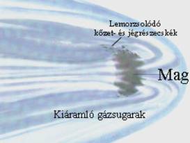 Amikor az üstökös a Naprendszer belsejébe, a Jupiter pályáján belülre kerül, a jég az üstökösmag koromszerű felszíne elnyeli a Nap melegét és az elpárologtatja a fagyott anyagot, a poranyag egy része kiszabadul. A világűr légritka terében a jég gázzá alakul anélkül, hogy közben folyékonnyá vált volna. (Ugyanez történik a Földön a szárazjéggel, a szilárd szén-dioxiddal.) Az elpárolgó gázokat a kis tömegű mag gravitációs vonzása nem tudja megtartani, így azok folyamatosan kiáramlanak a bolygóközi térbe, de egy részük légkör formájában körülveszi a magot, ez a kóma. |