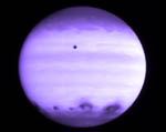 Az első megfigyeléseket a Hubble Űrteleszkóp készítette 1994. július 16-án. A magok több mint öt napon át zuhogtak a Jupiterbe, a gázóriás déli félgömbjének 43 - 44 fokos szélessége környékét többször is végigsorozva. Ezen az ultraibolya képen a Shoemaker-Levy 9 üstökös darabjainak becsapódásai láthatók. (A kép az ultraibolya tartományban készült. A becsapódási foltok sötétnek látszódnak, mert a szétszóródott por elnyeli a Nap sugarait. A bolygó egyenlítője felett az Io látható.) |