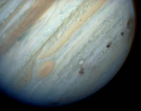 1994. július 16-a és 22-e között csapódtak be a Jupiter bolygóra a Jupiter körüli pályára került Shoemaker-Levy 9 üstökös korábban széttöredezett magjának darabjai. A Jupiter váratlan "megkondítása" bizony évszázadunk egyik legérdekesebb csillagászati eseménye volt. Ilyen vagy hasonló jelenségnek a megfigyelésére még nem volt módja csillagásznak a történelemben. Közvetlenül nem lehetett érzékelni az első becsapódásokat, mert a Jupiter túlsó oldalán történtek. A nagyon gyors, alig tíz órás forgásidejű óriásbolygó azonban már röviddel a becsapódások után felénk fordította a becsapódások érintette területeket. |