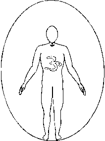 Az Om kántálása alatt képzeletben vetítsük a testünkre a mantra szanszkrit betűinek a képét (ahogyan az ábrán látható).