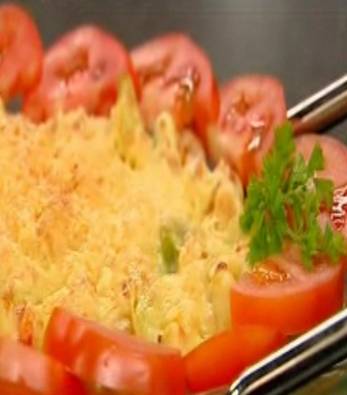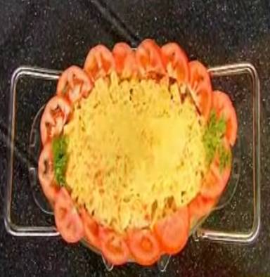 Egy tűzálló tálat (jenaj) olajjal kikenünk, ráhalmozzuk a babot, megszórjuk egy kis aprora vagott hagyma-val, rátesszük a darált húst, megszórjuk fűszerpaprikával, majd így folytatjuk, míg a hozzávalók el nem fogynak (lehet egy reteget is kesziteni : zoldbab, hagyma, daralthus, piros paprika, zoldbab, reszelt sajt; de lehet tobb reteget is). Tetejét megszórjuk reszelt sajttal.