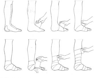 Az elasztikus (közepes, nagy megnyúlású) fáslizást ajánlatos mindig reggel elvégezni. A lábat enyhén plantárflexióban tartva, a fáslizást a lábujjak tövénél kezdjük, fölfele haladva "föl-le-föl" irányban a bokát befogjuk, majd a sarkat is. A nyomás értéke a láb és boka szintjén kell, hogy legyen a legmagasabb, majd felfele fokozatosan csökkenjen. A lokális nyomást emelhetjük, ha a belboka mögötti gödörbe, vagy a kívánt helyre (fekély fölé) vatta-párnát, vagy speciális habszivacsot helyezünk (a görbület sugarát csökkenti). Ha a görbület sugarát növeljük (pl Achilles ín mellé helyezett párnák) a Laplace törvény alapján a nyomást csökkentjük. A párnák lehetnek hidrofil vagy hidrofób anyagokból. A lábszáron az átfedések lehetnek ferdék (spirális fáslizás), 1-2 cm-es szabad széllel (hézag sehol nem maradhat), vagy 8-as alakúak ("kalász", "halcsontozat" mintát kölcsönözve a felhelyezett fáslinak).(18. ábra) A pólyázás másik technikája a meneteket a bokán indítja, de aztán lemegy az ujjakig, majd visszajön a sarokig és úgy halad fölfele. Ha a fásli túl hosszú és elértünk a kívánt proximális pontig, el lehet vágni, hogy ne helyezzünk fölösleges rétegeket a proximális végre, amely leszoríthatja a vénás áramlást, nyomot hagyva a bőrön. Az elasztikus pólyákat éjszakára le kell venni (nagy nyugalmi nyomás) és nem szabad alkalmazni súlyos érszűkület (DI kisebb mint 0,8-0,6), váladékozó kiterjedt bőrléziók, abcessus, flegmone esetén. Általában a kezelés aktív szakában (kifejezett ödéma) , vagy szövődmények esetén (nyílt lábszárfekély) alkalmazzuk, az elért eredmény fenntartására az elasztikus harisnyákat használjuk. Az a fásli, amelyik a bokánál, vagy a térdhajlatnál összegyűrődik a beteg számára elviselhetetlenné válik, kisebesedhet a bőre. A rugalmas pólyát fölhelyezés előtt rácmentesen tekerjük föl. A bokán ne legyen több menet, mint máshol, ne húzzuk meg jobban a fáslit itt (kisebb átmérő önmagában nagyobb nyomást eredményez). Ha csak lábszárat pólyázunk, arra lehetőleg két réteget tegyünk, az egyik menetei keresztezzék a másikat. Adipózus combra nem lehet fáslit feltenni. Ilyenkor a lábszárat fáslizzuk, majd erre húzzunk fel egy lágyékig érő harisnyát. Térden fölüli pólyázás esetén tegyünk védőlapot a térdhajlatba. Idős, gyenge mobilitási képességű egyéneknél inkább elasztikusabb fáslit (nyugalomban is hat), mobilisabb fiatalabb betegeknél kevésbé elasztikus fáslit javasolunk. Minél kifejezettebb az ödéma, annál kevésbé elasztikus pólyát és annál több réteget alkalmazzunk. Ilyenkor a járás elengedhetetlen a hatás eléréséhez. A fáslit hagyhatjuk néhány órára vagy napokig, egyénileg eldöntve. Végül, gyakran ütközünk a beteg elutasításába. Helyes informálással, a technikai részletek elmagyarázásával elnyerhetjük a beteg bizalmát.