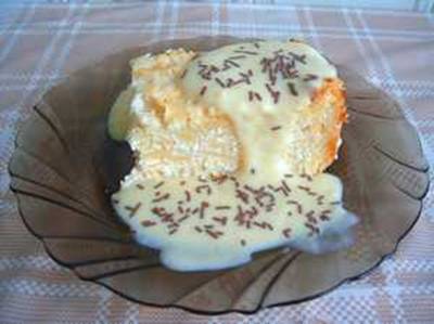 nagy kockára vágjuk, majd öntsük le a vaníliaöntettel. Melegen tálaljuk. Én még