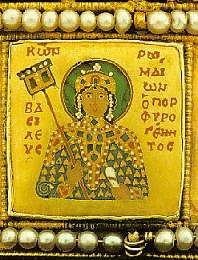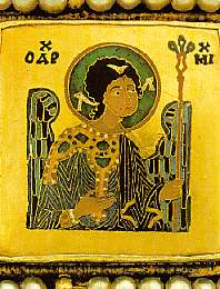 egészen addig, míg a hátsó uralkodó-képmásokig el nem érkezünk. Elöl a Pantokrátor Krisztus hozza le a földi közegbe a
