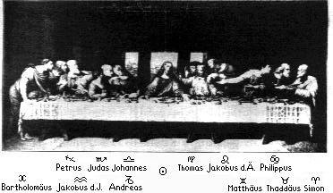 Leonardo da Vinci Utolsó vacsorája az Igazság Napjának (Sol Iustitiae = Jézus Krisztus) az évkörön való, különböző módú és mértékű szétsugárzását jeleníti meg, az apostolok az egymásra következő állatövi jegy-érvénytartamok megszemélyesítői (Beckerath 1984. nyomán)