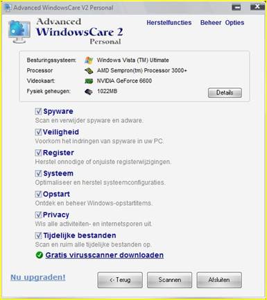 Er zijn nogal wat programma's die u in de gelegenheid stellen computer te onderhouden. Het programma wat we nu behandelen is er ook zo e 959m122j en. Met een klein verschil. Deze software maakt van verschillende programma's in een software pakket. Wel zeer handig. Dit is waarschijnlijk ook de reden dat het programma zeer geliefd is onder de gebruikers van Vista. Het programma waar we het over hebben is Advanced WindowsCare V2 personal.