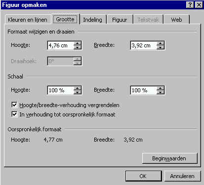 Met het tabblad 'Figuur opmaken' kun je de grootte van het figuur veranderen. Door de percentages te veranderen kun je het plaatje groter danwel kleiner maken: