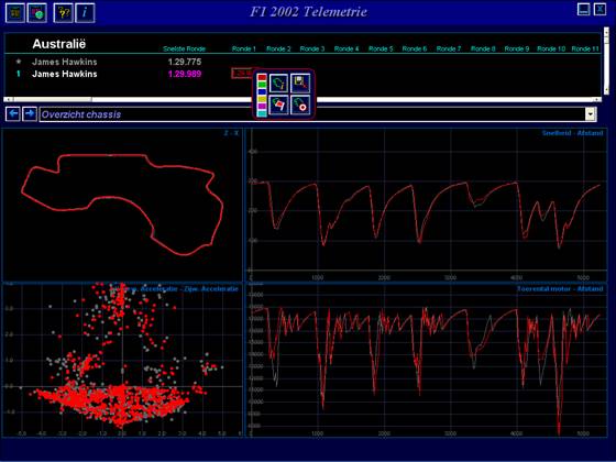 Linksboven in het scherm F1 2002 Telemetrie, zie je de volgende vier icoontjes: