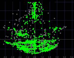 In de G-krachtengrafiek kun je zien dat het gewicht tijdens het remmen naar voren komt (omhoog in de grafiek). Hoewel alle coureurs aanvankelijk in een rechte lijn remmen, laten de beste coureurs de rem geleidelijk los terwijl ze de apex in draaien - een techniek die bekend staat als 'trail braking'. In deze grafiek zie je dat een coureur die niet aan 'trail braking' doet, of zijn wagen niet tot het uiterste laat gaan, niet effectief de grenzen van de grip benut. Deze grenzen liggen langs de randen van dit venster, dus met andere woorden: je gegevens moeten wijd verspreid over beide assen liggen. Het plaatje hieronder toont een referentieronde (grijs) met een goede trail braking-techniek, vergeleken met een ronde (groen) die in dat opzicht onderdoet voor de referentieronde.