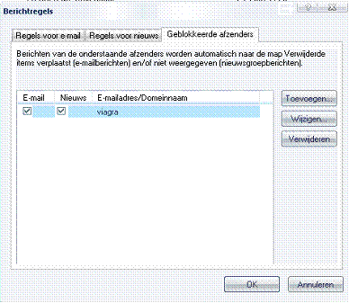 Nou kan je kiezen wat je gaat invullen zoals je in het plaatje ziet staan bijvoorbeeld [email protected] kan je neer zetten maar je kan ook gewoon viagra neer zetten dan blokt hij hem ook en dan zou het moeten werken bij mijn werkt het in iedergeval.