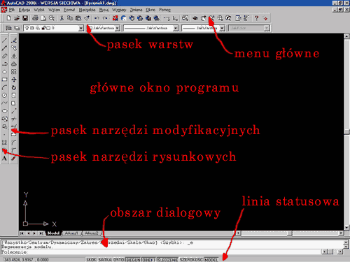 Tyle, jeśli chodzi o filozofię pracy z programem. Zasady są, jak sądzę, jasne i nieskomplikowane. Bardziej zaawansowani użytkownicy programu mogą powiedzieć, że to herezje. Można zmienić skalę oraz wprowadzić arkusz o określonych rozmiarach. Owszem, można. O ile jednak wprowadzenie arkusza o określonych rozmiarach może spowodować po prostu to, że nasz rysunek nie będzie się na nim mieścił (chociaż arkusz możemy w każdej chwili zmienić na inny), o tyle kiedy sporządzimy nasz rysunek w skali np. 1:2 i spróbujemy go zwymiarować, okaże się, że każdy wymiar jest 2 razy większy i będziemy musieli poświęcić kolejne 2 dni na ręczne ich zmienianie. Gorsza będzie próba edycji rysunku po upływie 2-3 miesięcy, kiedy nie będziemy już pamiętali, jakich sztuk dokonaliśmy podczas rysowania. Wtedy nie obędzie się bez rzucania w monitor ciężkimi przedmiotami. Wygląd głównego okna aplikacjiFirma Autodesk, producent programu AutoCAD, ściśle współpracuje z biurami projektowymi, czego wynikiem jest starannie przemyślany i bardzo użyteczny interfejs użytkownika. Wszystkie ikony są bardzo czytelne i intuicyjne, zebrane są w bardzo dobrze, moim zdaniem, zorganizowane grupy. Rysunek 1 przedstawia interfejs programu wraz z opisem poszczególnych grup. W kolejnych częściach cyklu stopniowo przybliżę kolejne paski narzędzi oraz poszczególne narzędzia w nich zebrane.