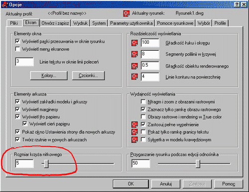Rozmiar krzyża nitkowego zmienia się poprzez przesunięcie suwaka (rys. 6). Łatwy ten AutoCAD, banalne operacje -- nauka idzie jak po maśle.
