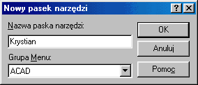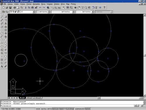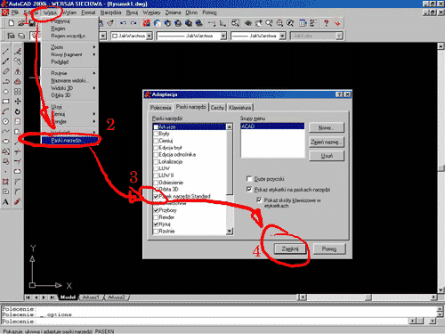 Z okienka tego wybieramy poszczególne paski narzędzi poprzez klikanie na krzyżykach obok nazw pasków. Będą one kolejno się pokazywały na ekranie. Jak widać, nauka AutoCAD-a przebiega bez większych problemów --