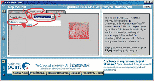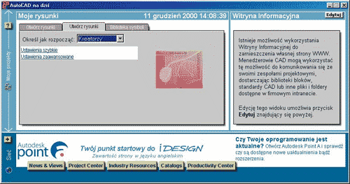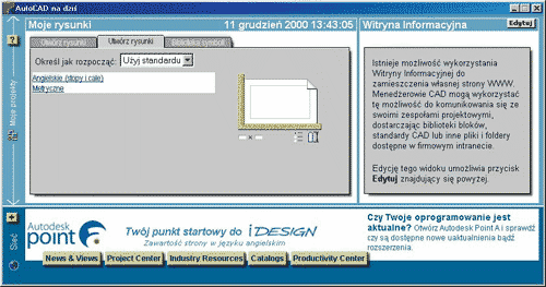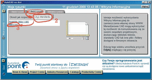 Otwieranie rysunkówTeraz już dokładnie wiemy, w jaki sposób tworzyć nowe rysunki z zastosowaniem szablonów oraz kreatorów. Co jednak zrobić, jeśli wykonaliśmy rysunek za pomocą kreatora czy z zastosowaniem standardu i przypomniało nam się, że jednak chcemy zmodyfikować lub obejrzeć jeden z rysunków, które udało się nam np. pobrać z sieci. Możemy zamknąć program i po ponownym jego uruchomieniu kliknąć na zakładce Otwórz rysunki (AutoCAD 2000i -- rys. 8a).