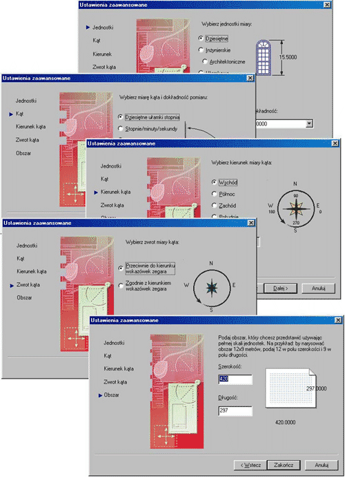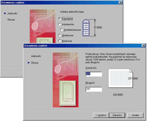 Kolejne kroki są zależne od wybranej opcji i różnią się liczbą danych możliwych do ustawienia: o wybranie opcji związanej z szybkimi ustawieniami pozwala na ustawienie jednostek oraz obszaru rysunkowego (rys. 7a); o wybranie opcji związanej z ustawieniami zaawansowanymi pozwala na ustawienie jednostek, zmianę miary kątów i ich dokładności, kierunku kąta, zwrotu miary kąta oraz wielkości obszaru rysunkowego (rys. 7b).