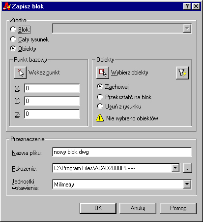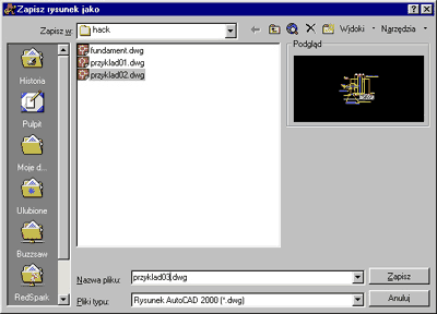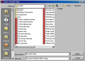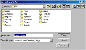 Pamiętajmy, że AutoCAD standardowo pozwala na otwieranie plików z rozszerzeniem DWG. Istnieje jednak również możliwość otwarcia plików w formacie DXF oraz szablonów posiadających rozszerzenie DWT. Oczywiście AutoCAD posiada wiele możliwości związanych z importowaniem rysunków w innych formatach niż DWG -- ten problem przedstawię później. Omówię także bardziej zaawansowane funkcje, takie jak np. częściowe otwieranie rysunków. Zapisywanie rysunkówSkoro potrafimy już otworzyć rysunek oraz stworzyć nowy projekt, nadszedł czas na zapisanie efektów naszej pracy. Zapisywanie rysunków do pliku jest stosunkowo prostym działaniem. Podczas pierwszego zapisywania rysunku klikamy Plik->Zapisz, co spowoduje otwarcie okna dialogowego pozwalającego na zapis rysunku (okna te różnią się nieznacznie w programach AutoCAD 2000 i 2000i -- rys. 9a, 9b).