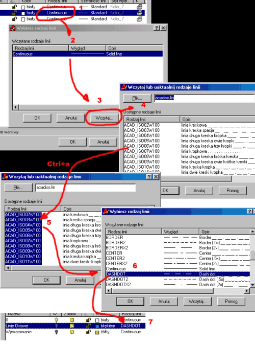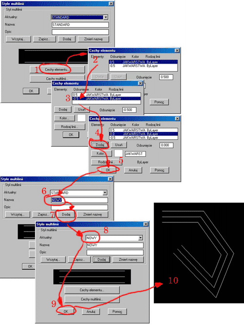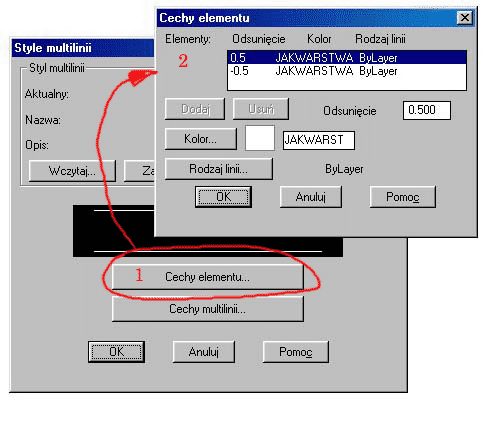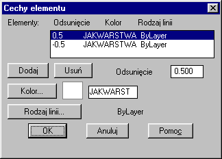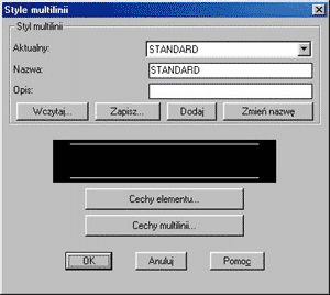 Kiedy mamy już utworzony nowy styl, nadszedł czas na dokonanie zmian w jego wyglądzie. Służą do tego przyciski znajdujące się pod rysunkiem przedstawiającym aktualny wygląd multilinii. Po wciśnięciu przycisku Cechy elementu... generowane jest okno dialogowe, pozwalające na dodawanie linii do aktualnie tworzonego stylu (multilinia może składać się np. z 4 linii), na zmianę koloru poszczególnych linii czy zmianę ich rodzaju, np. na linię przerywaną.