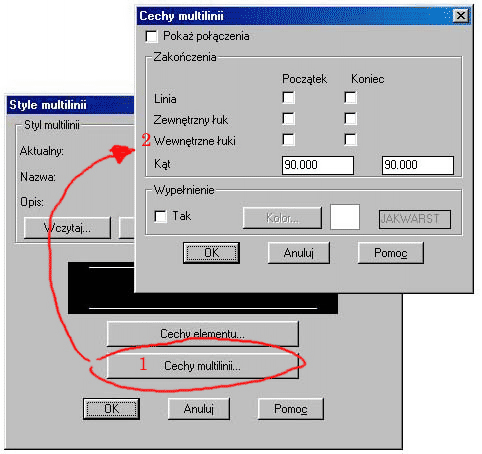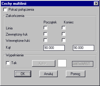 Po wciśnięciu przycisku Cechy multilinii... generowane jest okno dialogowe, pozwalające na określenie parametrów związanych z wyglądem takich elementów multilinii jak np. zakończenia czy wypełnienie powstające pomiędzy liniami multilinii.