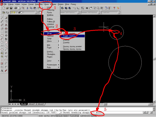 możemy wskazać jedynie jego środek i długość promienia. A co zrobić, jeśli chcemy wstawić okrąg pomiędzy dwie istniejące proste czy zamiast promienia chcemy wstawić średnicę? W takich przypadkach najprościej skorzystać z menu głównego i sprawdzić, czy wymienione przez nas przypadki są tam umieszczone. Łatwo znajdziemy tam opcję Rysuj -> Okrąg i już mamy szereg możliwości wykreślenia okręgu z zastosowaniem punktów charakterystycznych.