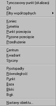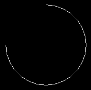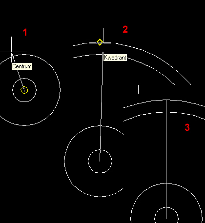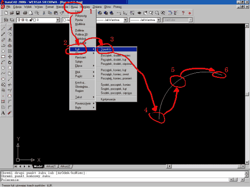 górne menu zawiera natomiast całą skarbnicę możliwości wstawiania łuków. Jako że podczas rysowania obiektów takich jak okręgi czy łuki dobrze jest korzystać z zasad rysowania precyzyjnego, proponuję przećwiczenie rysowania łuku na jednym przykładzie, związanym z rysowaniem łuku przez trzy niezależne punkty. Przećwiczenie pozostałych funkcji zostawmy sobie na długie zimowe wieczory, podczas których będziemy ćwiczyć możliwości programu, uzupełniając swoją wiedzę o coraz to nowe funkcje. Kliknijmy zatem ikonkę rysowania łuku i wskażmy kolejne trzy punkty na ekranie w następującej kolejności -- początek, środek, koniec.