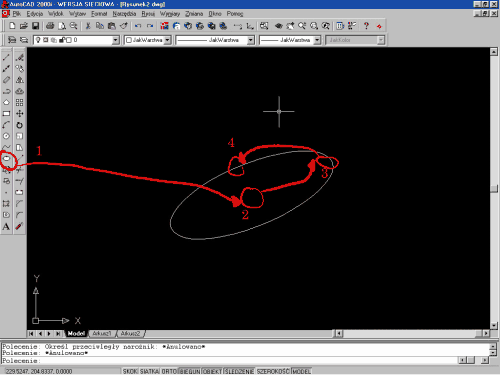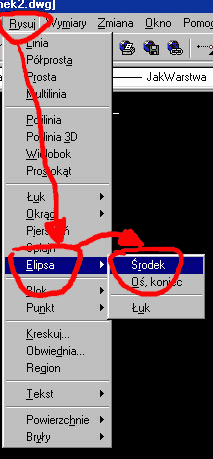 Stale namawiam do zaczekania na lekcję związaną z rysowaniem precyzyjnym, a to z prostej przyczyny -- nawet najbardziej początkujący adept AutoCAD-a znudzi się strasznie szybko, klikając bez celu na ekranie i "ciesząc się", że kolejne narysowane łuki różnią się nieznacznie od poprzednich, a kolejne okręgi są do siebie łudząco podobne (koszmar!). Mam więc nadzieję, że czytelnicy nie będą mi mieli za złe tak skrótowego potraktowania tego tematu i przedstawienia jedynie podstawowych zasad dotyczących tych funkcji. Ale wróćmy do tematu naszej lekcji, czas narysować elipsę. ElipsaNarzędzie Elipsa, podobnie jak Okrąg i Łuk, znakomitą większość swoich funkcji skrywa w górnym menu programu.