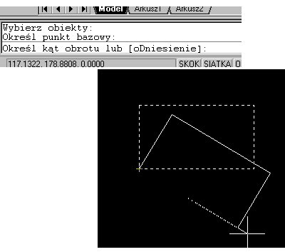 po czym w linii poleceń wpisujemy literę N (która oznacza, że chcemy utworzyć nowy lokalny układ współrzędnych), a następnie wskazujemy lewy dolny róg prostokąta. Program w tym miejscu wstawi lokalny układ współrzędnych. Od tej pory w punkcie tym są następujące współrzędne: x=0, y=0, z=0.