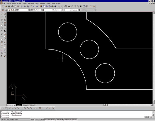 Teraz możemy już zaokrąglić krawędzie w narożnikach. W kolejnym kroku narysujemy okręgi wraz z liniami środkowymi oraz wprowadzimy kreskowanie. Zwróćmy uwagę, że kiedy rysujemy na jednej rzutni i przenosimy się do innej (za pomocą kliknięcia w nią), narzędzie rysunkowe nie przestaje działać i dalej możemy przy jego pomocy edytować tworzony przez nas projekt. Co więcej, narysowanie linii na jednej z rzutni powoduje, że jest ona automatycznie widziana na pozostałych. Teraz temat rzutni jest już chyba w stu procentach opanowany: wiemy, jak je włączać, jak na nich rysować, a także -- do czego służą. Jednak to jeszcze nie wszystko. Otóż, nasze wygenerowane w pocie czoła rzutnie możemy w razie potrzeby łączyć w jedną. Niezbędny jest tylko jeden warunek: powinny leżeć obok siebie. W tym celu klikamy kolejno Widok->Rzutnie->Połącz, po czym wskazujemy pierwszą rzutnię do połączenia i potem drugą rzutnię, a AutoCAD już zupełnie automatycznie łączy ze sobą zaznaczone obszary.