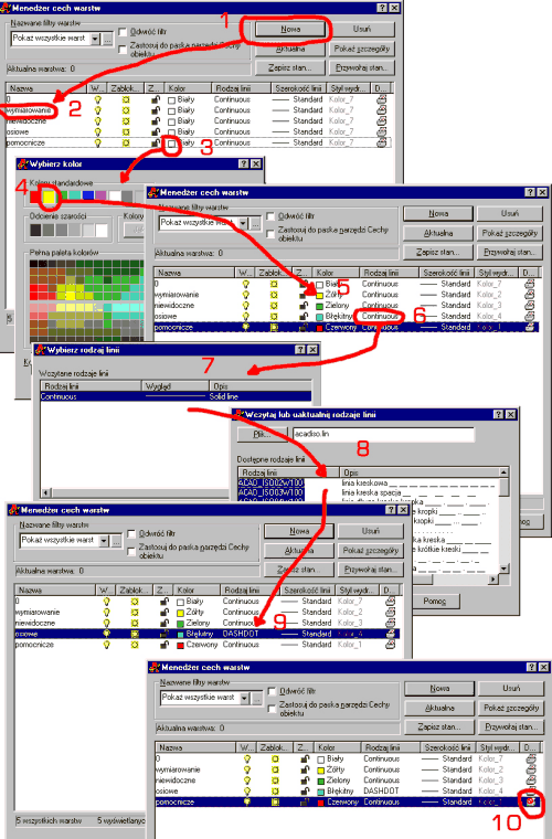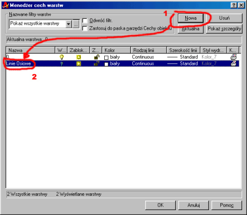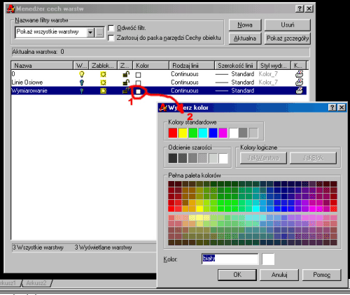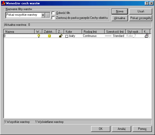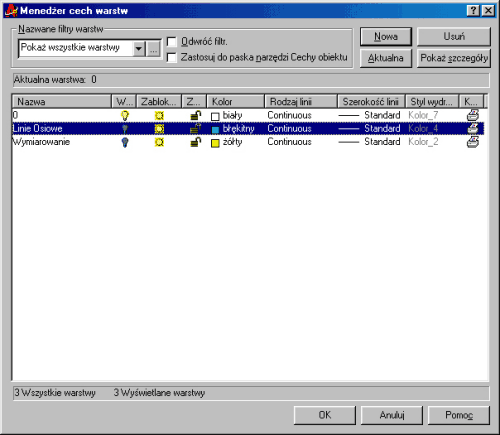 Poprzednie lekcje pokazywały, jakie parametry można ustawić przy pomocy edycji stylów. Przypomnijmy, że ustawialiśmy styl wymiarowania, styl tekstu itd. Dlaczego wspomniane lekcje były takie ważne? Otóż, wiadomości zawarte w tych lekcjach będą teraz wykorzystywane przez nas do wykonania szablonu pliku projektowego. Taki szablon można przygotować raz, stosując tak zwaną "burzę mózgów" w celu ustalenia jego wszystkich elementów. Następnie umieszczamy taki plik w ustalonym miejscu w sieci i każdy pracownik biura projektowego ma do niego swobodny dostęp. Wszystkie lekcje, które do tej pory przestudiowaliśmy, miały na celu ograniczenie pracochłonności tworzenia projektu. Dzisiejsza lekcja będzie niejako zwieńczeniem poprzednich. Nie wydłużając wstępu w nieskończoność, proponuję zabrać się do konkretnej pracy. Najpierw ustalimy, co ma zawierać nasz szablon rysunkowy. Na pewno jedną z najważniejszych rzeczy przy tworzeniu szablonu rysunkowego dla biura projektowego jest ustalenie kolorów warstw i wszystkich parametrów z nimi związanych. Zacznijmy więc od tego punktu. Otwieramy nowy rysunek i zakładamy sobie komplet używanych warstw -- wraz z przypisaniem im odpowiednich parametrów związanych z kolorem oraz rodzajem linii. Mój szablon rysunkowy będzie zawierał jedynie kilka podstawowych warstw, lecz można przygotować taką ich ilość, jaka będzie potrzebna w danym biurze. Zagadnienie zakładania warstw zostało omówione w lekcji 12. (kurs dla początkujących), dlatego w tym miejscu pokażę tylko wynik założenia przeze mnie warstw.