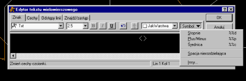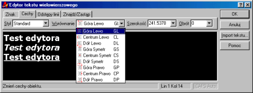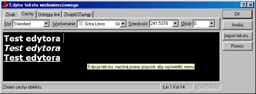 Od razu można dokonać edycji naszego stylu tekstu -- proponuję zatem zmienić domyślną czcionkę stylu na Arial CE, a jej wielkość na 10. Po potwierdzeniu wyboru przyciskiem Zastosuj możemy zamknąć okno dialogowe -- styl został utworzony. Od tej chwili, jeśli wybierzemy nasz styl tekstu, nie będziemy musieli zmieniać domyślnych ustawień czcionki. styl multiliniiKolejnym stylem, jaki omówię, będzie styl multilinii. Aby zmienić ustawienia standardowego stylu multilinii lub stworzyć własny styl, musimy uruchomić okno zatytułowane Style multilinii Format -> Styl multilinii...