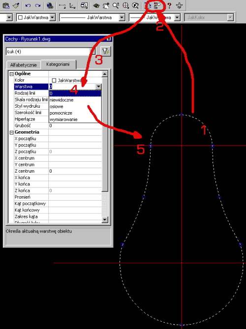 Zostawmy na razie pozostałe funkcje, omówimy je dokładnie po zapoznaniu się z zasadami rysowania precyzyjnego. Omówimy też wtedy szerzej elementy pominięte w poprzednich lekcjach. Przejdźmy teraz do rysowania łuku. ŁukZ rysowaniem łuku jest podobna historia jak w przypadku okręgu -- na pasku mamy najczęściej używaną opcję w postaci ikony