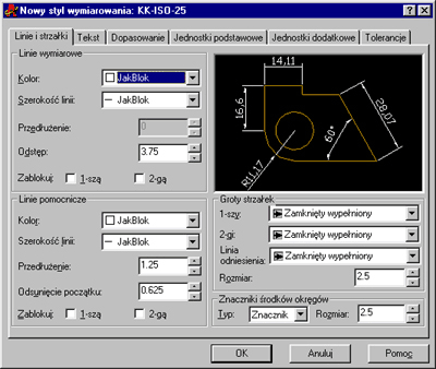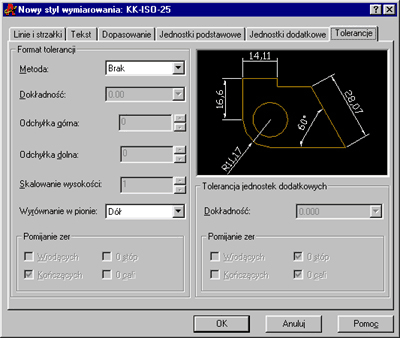 Kolejna zakładka, Jednostki podstawowe, jest związana z określeniem formatu jednostek wymiarowania. Zakładka ta służy w całości do ustalenia takich parametrów jak dokładność wymiarów (liczba miejsc po przecinku) czy wygląd separatora dziesiętnego.