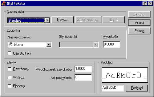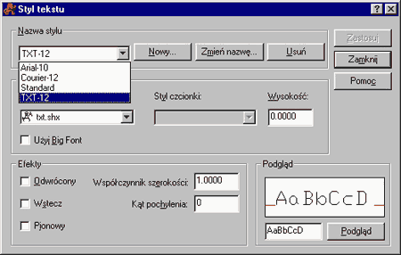 Poprzednia lekcja w całości została poświęcona generowaniu stylu wymiarowania używanego w danym rysunku. Na dzisiejszej będą omówione kolejne style. Tym razem postaram się przybliżyć styl tekstu, styl multilinii i styl punktu. Umiejętność operowania stylami poszczególnych narzędzi będzie bardzo przydatna podczas tworzenia naszego własnego szablonu rysunkowego, a zatem warto poświęcić chwilkę na zaznajomienie się z tym tematem. styl tekstuZacznę od stylu tekstu. Aby wygenerować nowy styl tekstu bądź dokonać zmian w aktualnym stylu, każdorazowo musimy otworzyć okno dialogowe zatytułowane Styl tekstu. Aby okno zostało otwarte, musimy przeprowadzić następującą akcję: Format -> Styl tekstu.... Pojawi się przedstawione poniżej okno dialogowe.